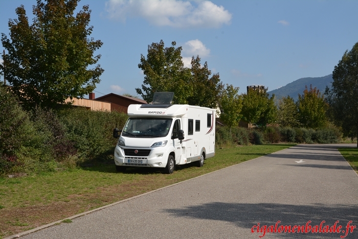 Pour profiter néanmoins de cette belle journée chaude et ensoleillée, nous refranchissons la frontière et nous nous installons sur l’île du Rhin de Biesheim. Quelques camping-cars sont déjà stationnés mais nous trouvons de la place facilement.