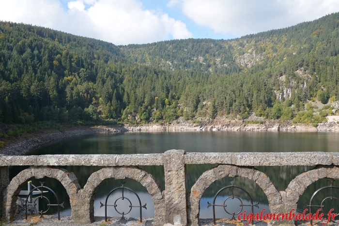 À l’issu de la promenade, nous reprenons le camping-car et gagnons tout d’abord les bords du lac blanc. C’est un beau lac de montagne à 1055 m d’altitude dans lequel se mirent les roches tout autour. Il sert de réservoir au lac noir situé à 120 mètres en contre-bas où une centrale hydraulique permettait la production d’électricité. « Permettait » car cet ouvrage n’existe plus, noyé par les eaux du lac en 2002 et démoli 12 ans après.