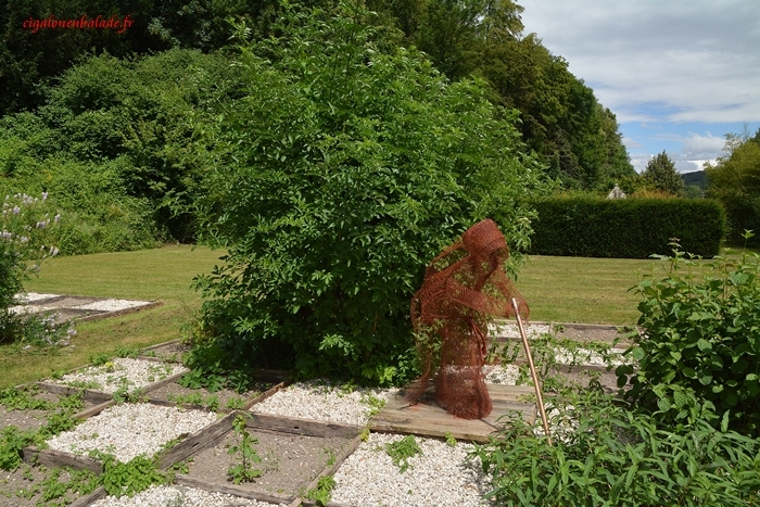 Des sculptures en treillis disséminées un peu partout autour de l’abbaye figurent les moines en activité.