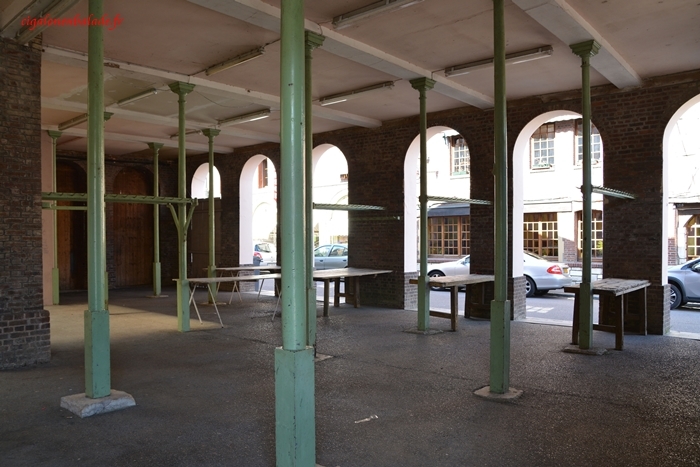 Nous nous arrêtons un petit instant sous les halles pour admirer leur structure. Elles occupent une partie de la mairie.