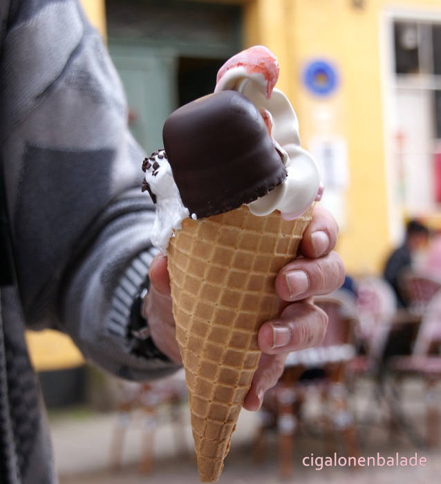 Ayant laissé les chiens dans le CC, nous en profitons pour aller manger une glace : une « giant » composée de deux boules, d’une glace à l’italienne, d’une boule choco et d’un nappage. Énorme et tout ça dans un cornet cuit sur place. Nous la dégustons à l’extérieur tout en suivant avec attention ce qui se passe dans la rue.