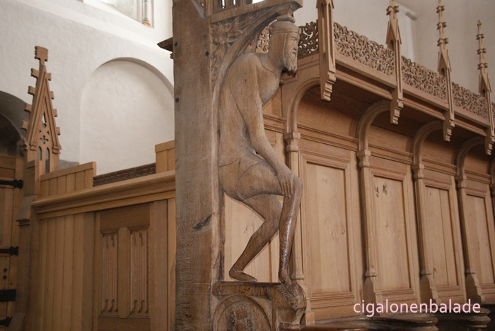Autour de l’autel, les accoudoirs des stalles représentent des têtes de chiens.