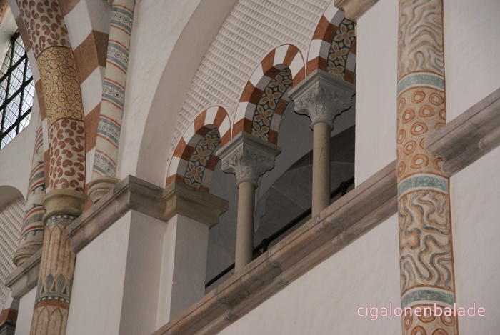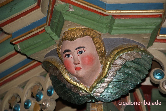 Les chapiteaux sont décorés par des petits bonhommes assis ou debout, à chaque fois différents, qui soutiennent eux aussi des colonnes peintes.