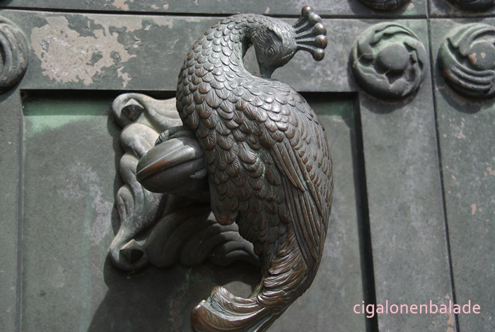 Avant d’entrer dans l’édifice, il ne faut pas manquer de regarder les portes remarquables pour la forme de leurs heurtoirs et poignées : un escargot, une fillette flottant, un lion, un paon.