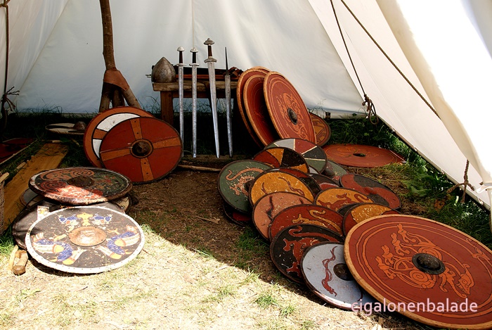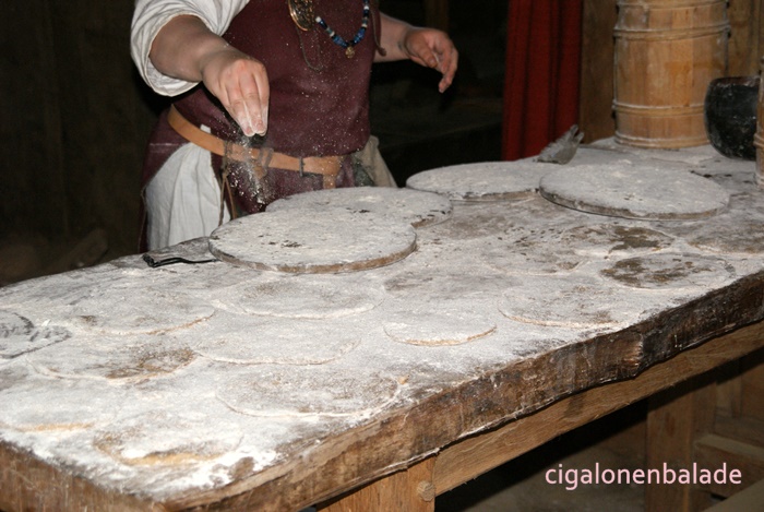 A notre entrée, certains Vikings sont en train de faire à manger : du saumon sur le grill, de la soupe ... Partout on s’affaire mais de préférence à l’ombre car le soleil tape aujourd’hui. Et sans cesse on va remplir la cruche à la fontaine, en l’occurrence ici un simple robinet !
