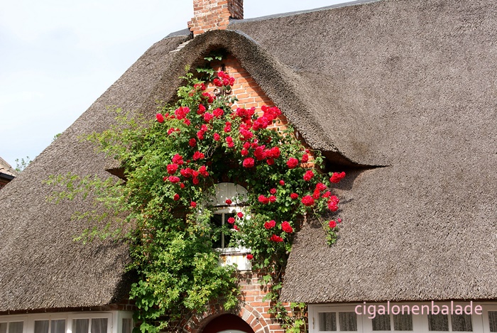 Bâties en briquettes de couleurs, peintes ou chaulées, certaines sont recouvertes de chaume. Là aussi, des rosiers poussent le long des façades.