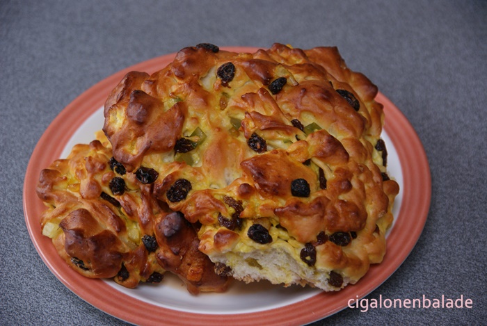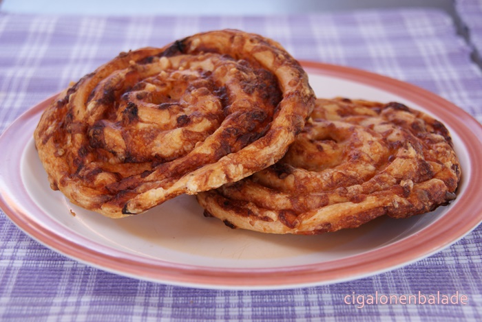 Auparavant, nous nous arrêtons dans une boulangerie pour acheter notre goûter. Croyant prendre des escargots aux noisettes, je lis sur la caisse enregistreuse le mot «pizza». Prise d’un doute, j’interroge la vendeuse qui me confirme qu’il s’agit bien d’une pâtisserie salée… Tiens, tiens on a déjà vu ceci ailleurs ! Mais cette fois-là, il a fallu attendre le petit déjeuner pour se rendre compte que les petits pains au chocolat étaient en fait des friands à la viande !