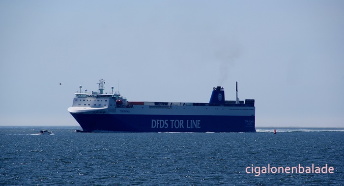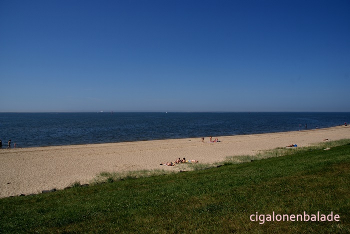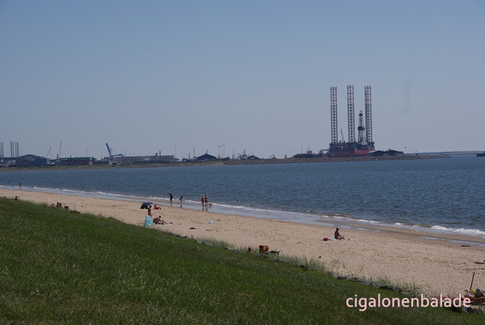 Quelques courageux se baignent ! Chez nous les seules courageuses seraient les chiennes mais comme Osiris ne peut pas s’empêcher de laper l’eau, la baignade dans la mer lui est interdite. Au loin, nous pouvons observer le va-et-vient des porte-conteneurs dans l port.