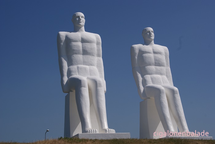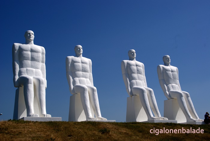 Nous nous arrêtons côté mer, derrière les dunes. Quatre colosses haut de 9 mètres, en béton armé, éclatent de blancheur au soleil, face à l’eau. Ce sont les «Mennessket ved Havet» réalisés en 1996 par Svend Wiig Hansen…