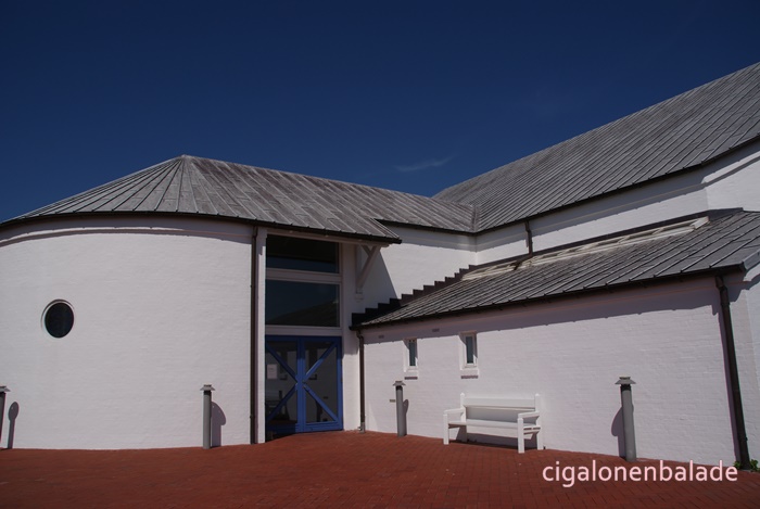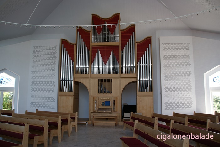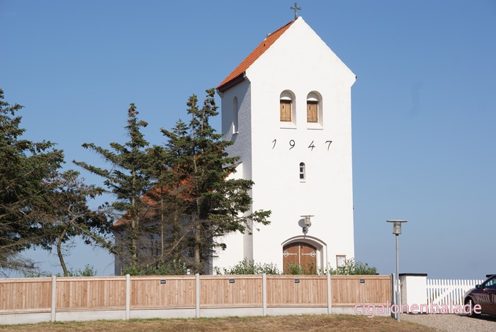 A Hjerting, nous visitons l’église ultra moderne. C’est la première que nous voyons de ce type. Jusqu’à présent, les édifices étaient soit construits en briquettes rouges, soit peints en blanc.