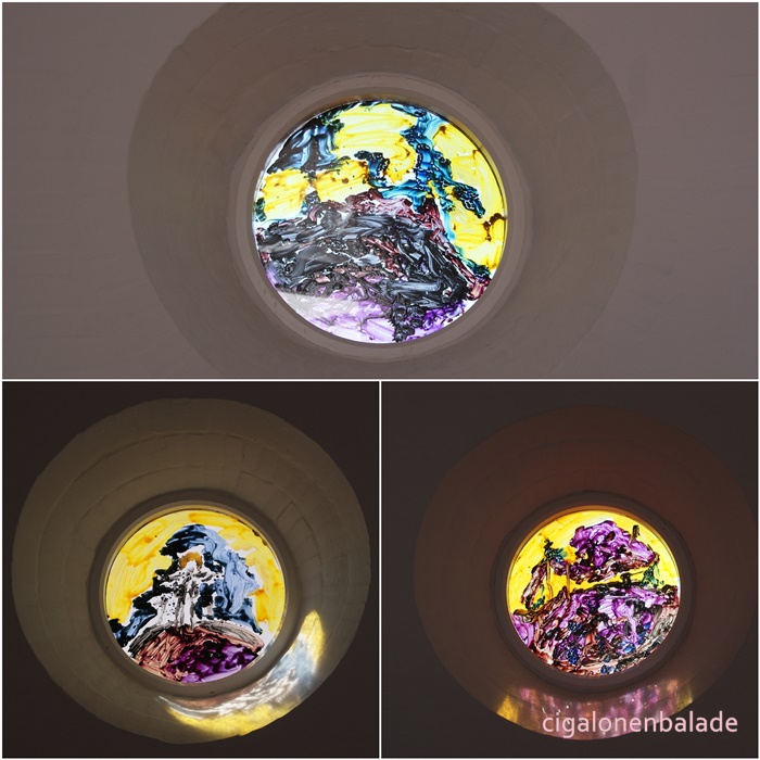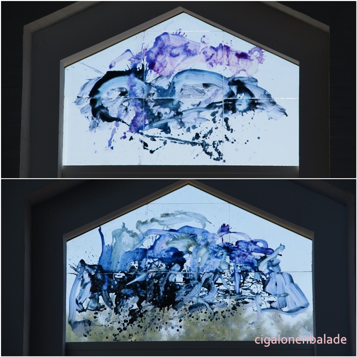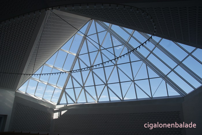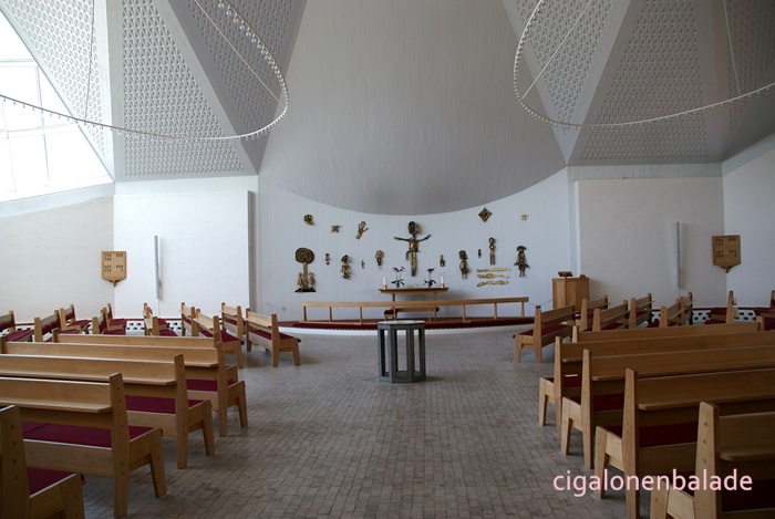 On est loin de la forme traditionnelle de l’église. L’intérieur est vaste et très clair.