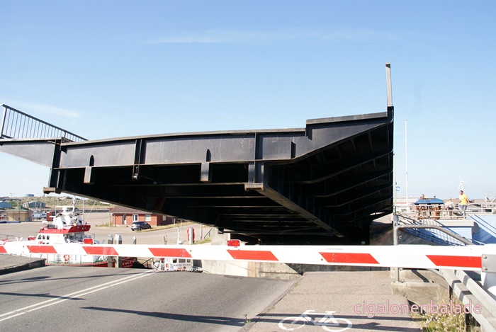 A Hvide Sande, nous sommes obligés de stopper Cigalon devant le pont qui franchit le canal reliant la mer au fjord pour permettre à un voilier de gagner la mer.