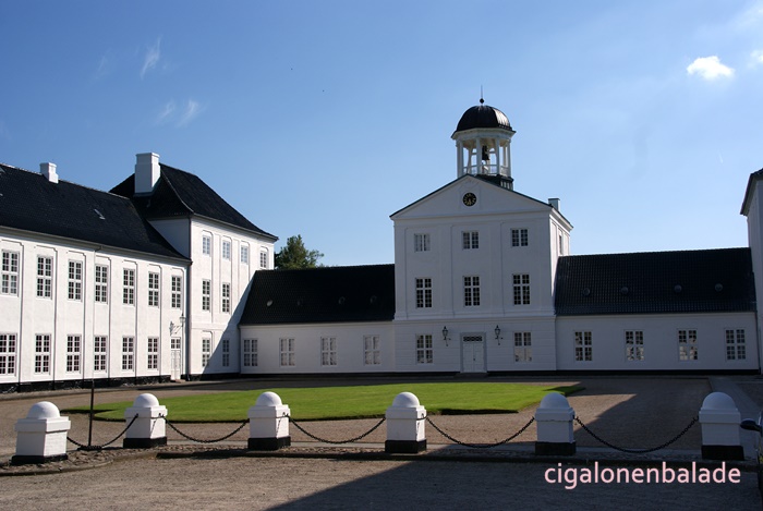 Le château, tout blanc et trônant au milieu d’un énorme parc, entouré d’eau et de forêt, ne se visite pas mais l’accès au parc est libre. Une notice explicative en danois, anglais et allemand attend même le visiteur. Aucune interdiction …