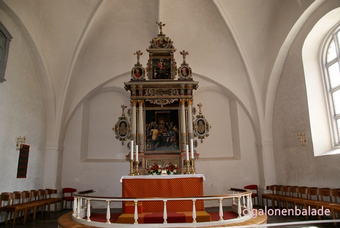 Pendant que Gabriel sort la ménagerie de la niche, j’en profite pour faire un petit tour à l’intérieur de l’église. La majorité des Danois sont de confession luthérienne. L’église est dépouillée sauf les tableaux sculptés. Le temps de prendre quelques photos et par la même occasion le frais et la visite de Sønderborg peut commencer !