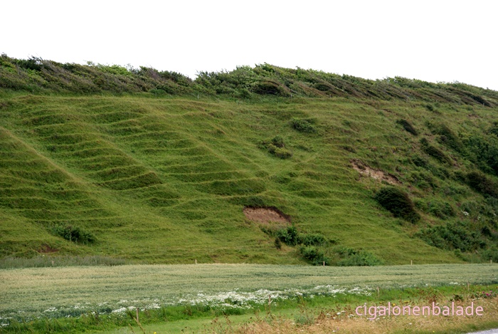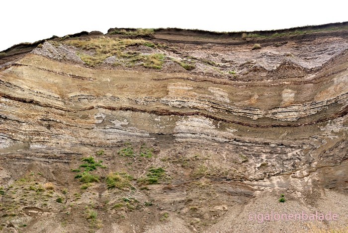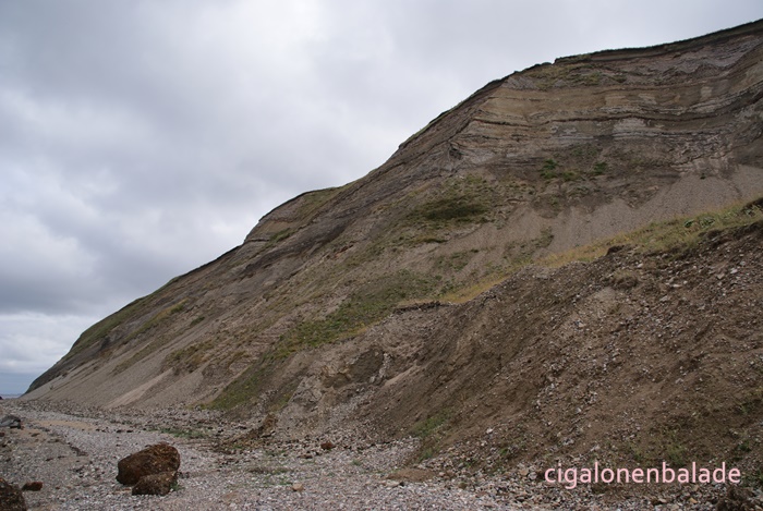 Les falaises sont constituées de cendres volcaniques et de craie. Nous ramassons quelques « cailloux » bigarrés blancs et noirs pour ma collègue Claire. En cas de fort vent, le passage est inutilisable car l’eau monte. Aujourd’hui, l’eau est agitée d’un petit clapotis, peu dangereux. Un sentier raide et rendu glissant par la pluie nocturne mène au sommet.