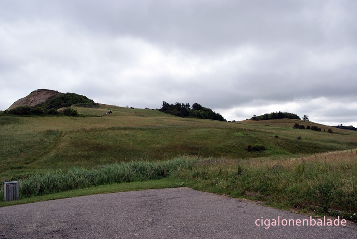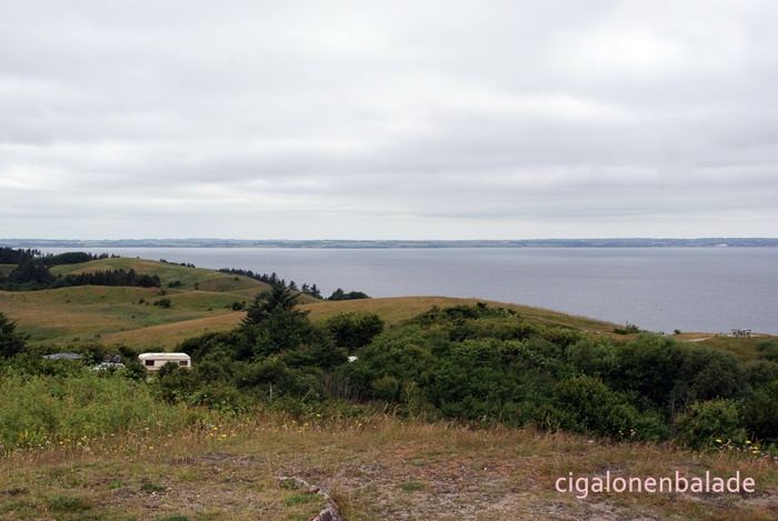 Pour déjeuner, nous nous arrêtons sur le petit parking au SalgjerhØj, où se situe le point culminant de Mors, sur un tumulus datant de l’âge du bronze, d’une altitude de 89 m – on ne rigole pas ! – et d’où la vue à 360° porte sur la majeure partie de l’île. Un pic … arrondi surmonté d’une pierre.