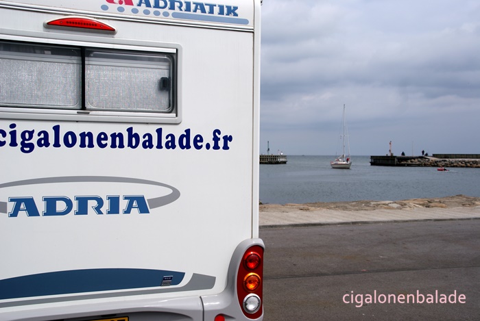 Pour déjeuner, nous déplaçons Cigalon sur l’arrière du parking, près de la digue. Un essai de connexion aboutit et je peux ainsi mettre en ligne le compte-rendu d’hier ainsi que les photos. Une bonne chose de faite ! Je suis à jour !