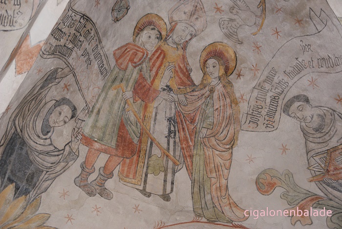 On peut avoir un aperçu de la hauteur de la précédente voûte grâce à une fresque située sur le mur nord qui date d’avant la transformation de l’église paroissiale en abbatiale.