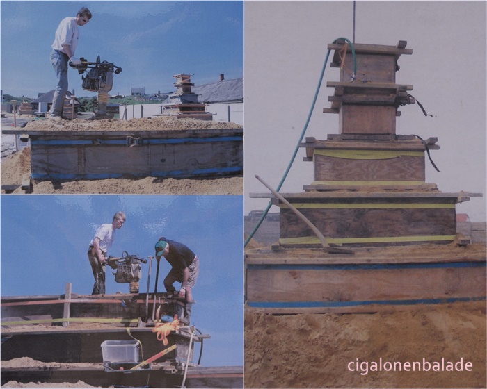 Le sculpteur travaille par étapes : Avant même de commencer la sculpture, l’artiste doit fabriquer des caissons en bois dans lesquels, il met du sable et de l’eau qu’il compresse avec un patin vibrant. Il assemble les différentes formes puis se met à la sculpture proprement dite en commençant logiquement par le haut.