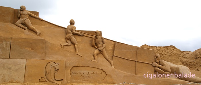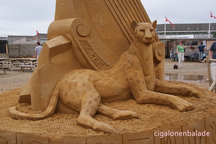 Un petit passage à l’OT où l’hôtesse essaie de dire quelques mots en français – c’est tellement rare qu’il faut le noter ! - nous permet de situer le festival des sculptures sur sable. Nous avons préféré laisser les chiens dans leur niche car avec la pluie récente, j’ose à peine imaginer leur état au retour de la visite. Néanmoins comme presque partout au Danemark, ils ont droit d’entrer, tenus en laisse. Nous voyons d’ailleurs peu d’interdictions. Les Danois ont l’air de s’auto-discipliner. On peut être surpris du peu de papiers qui traînent au sol. Peut-être dû au grand nombre de poubelles installées un partout ? Pas de mégots non plus d’ailleurs … Propre …