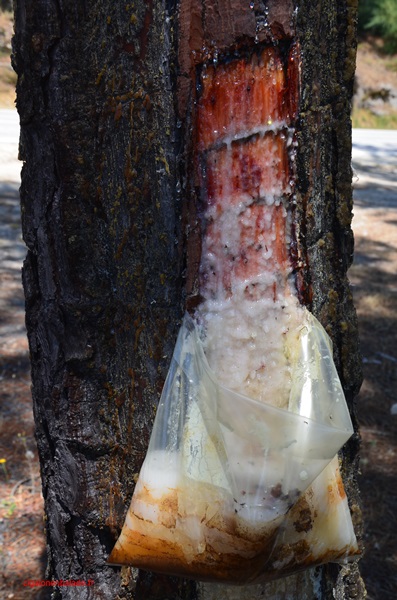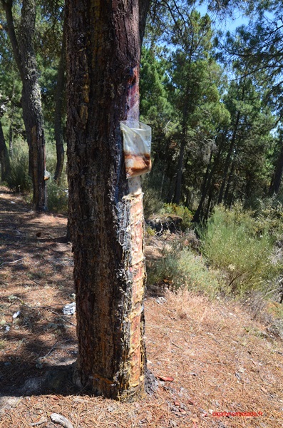 Nous apercevons aussi des pins auxquels on a accroché des sacs pour récolter la résine. Si le gemmage a pratiquement disparu en France, ce n’est pas le cas au Portugal où l’on trouve fréquemment, au bord des routes, des pins maritimes portant de petits sacs ou des petits pots en fer. Le gemmeur entaille l’écorce du pin afin d’activer la production de résine. Le pin, blessé, va produire de la gemme pour sa cicatrisation. Un pin est prêt à être résiné lorsqu’on peut l’entourer de son bras sans apercevoir sa main. Plus, il fait chaud, plus la résine coule.