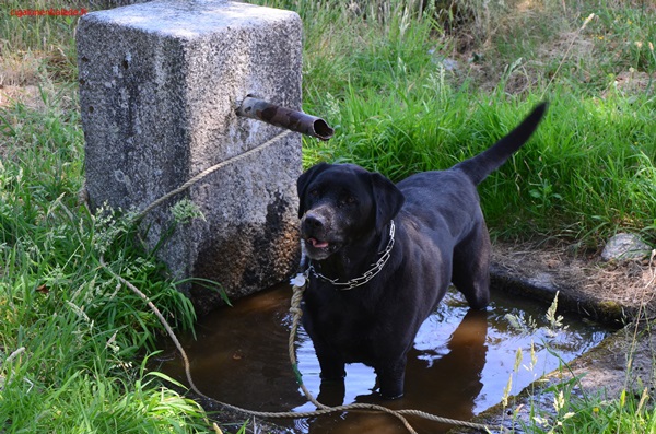 Nous finissons par trouver un petit parking avec une fontaine qui fait la joie de Douchka. Inutile de songer à remplir le réservoir de Cigalon. L’eau coule comme un pipi de chat ! La chienne s’installe dans le bassin pour se rafraîchir mais finit vite par se lasser : trop peu d’eau et pas assez grand !