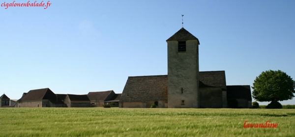 Avant d’entrer dans le village, nous découvrons une magnifique chapelle romane couverte d’une toiture en pierre de lave qui émerge des champs d’orge. Une note verte dans tout le jaune des colzas. Tout à côté la ferme semble avoir été construite en même temps.