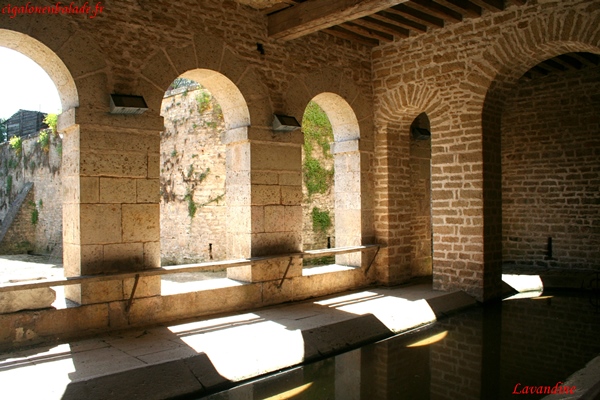 Le lavoir, quant à lui, il est à l’extérieur des fortifications. L’ensemble est en assez mauvais état, les algues recouvrent les bords du bassin et les murs. On note ici aussi la présence d’une cheminée.