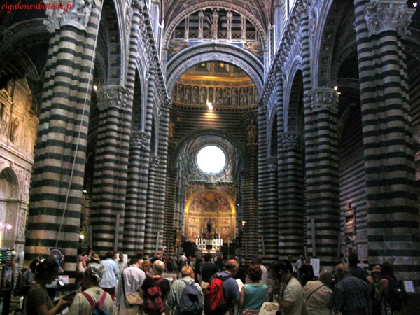 Le pavement, unique au monde, date du XVème et XVIème siècle. De toute beauté, il est composé de 56 panneaux en marqueterie de marbre ou en graffites qui représentent des scènes de l’Ancien Testament ou des personnages mythiques. Pour les préserver, les fresques sont visibles par roulement.