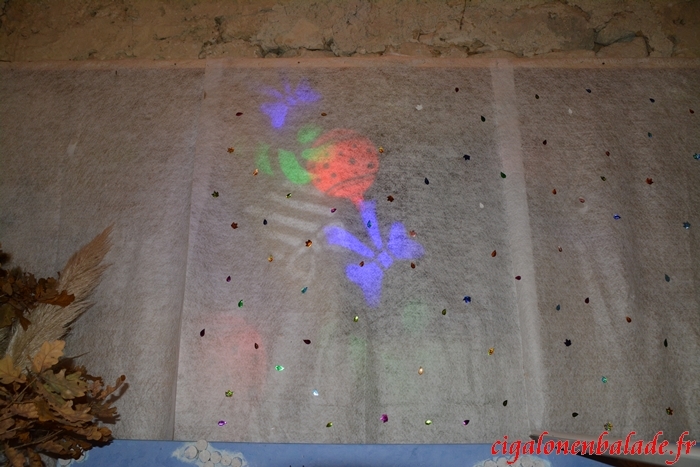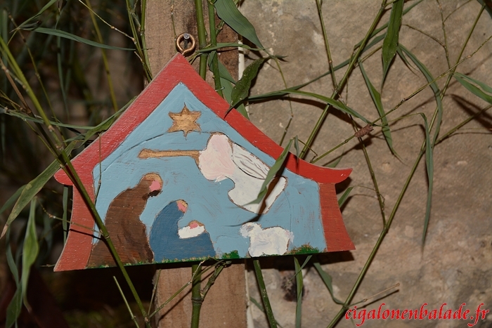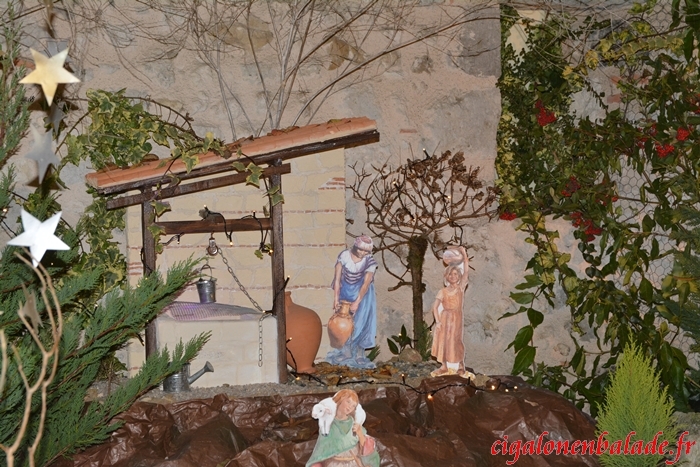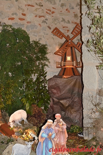 L’association Amistat présente une jolie crèche sous le porche sur le thème « Autour de chez nous ». Un panneau explicatif permet de mieux comprendre la mise en scène et de suivre le personnage qui s’illumine au fil de ses pérégrinations. Il s’agit de lo caminador, ce qui signifie le randonneur mais il me plait à penser qu’il s’agit d’un jacquaire car le chemin de Compostelle passe tout près de Foulayronnes.