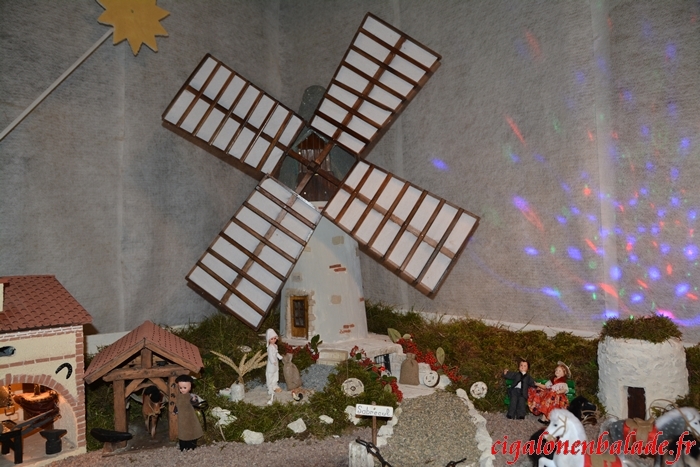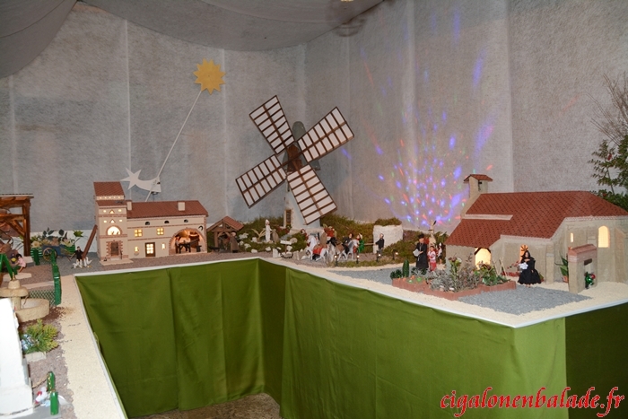 De beaux chants de Noël nous accueillent. C’était la crèche que j’avais préférée la dernière fois, du fait de son côté religieux et serein. Nous sommes dans un paysage champêtre sur lequel veille un moulin, avec comme toile de fond la photo de l’église.