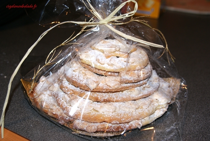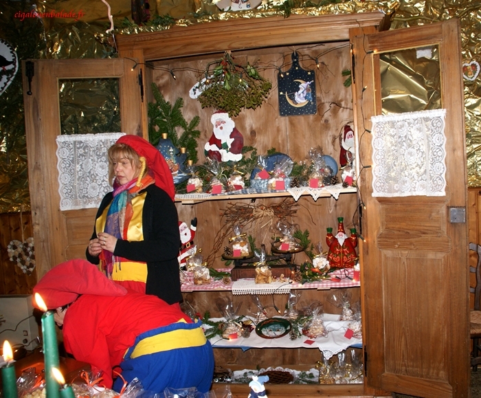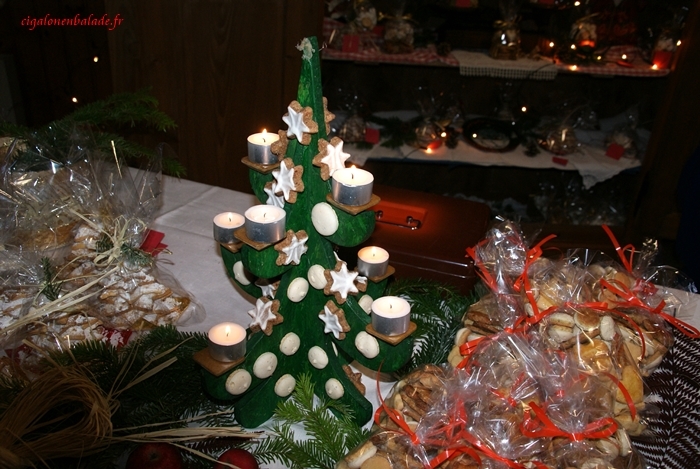 A la Bredelestub, c’est une symphonie d’ors, verts et rouges. Les lutins vendent des bredele de toutes sortes. Nous achetons des Mandelberg, spécialité de Mittelwihr. Ce sont les seuls que je ne fabrique pas moi-même.