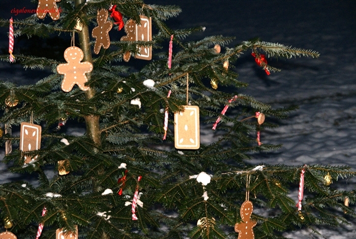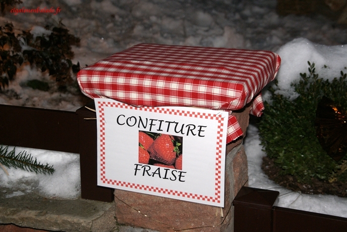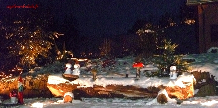 Une buche géante émerge de la neige. Des pains d’épices en bois découpé ornent les jardins.