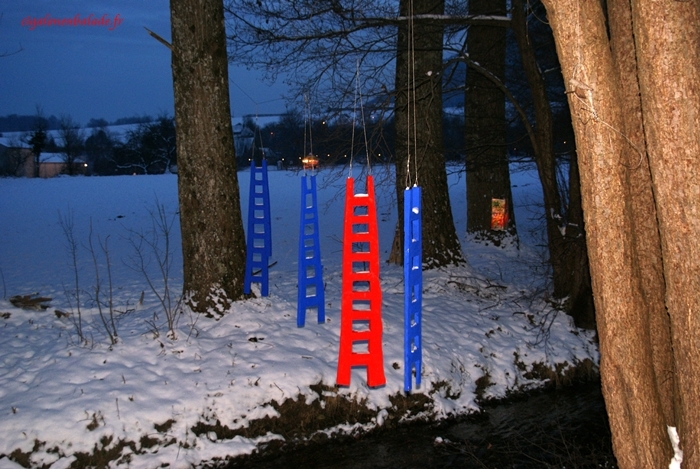 Des échelles bleues et rouges symbolisent le passage du ciel à la terre et de la terre au ciel et apportent une note colorée dans la nuit.
