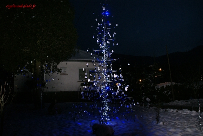Les sapins modernes sont fabriqués avec tous les matériaux et ont toutes les couleurs. Un sapin vert, constitué de cannettes, garde les traces des récentes chutes de neige. Un peu plus loin, un sapin en métal illumine la nuit de sa lueur bleutée.
