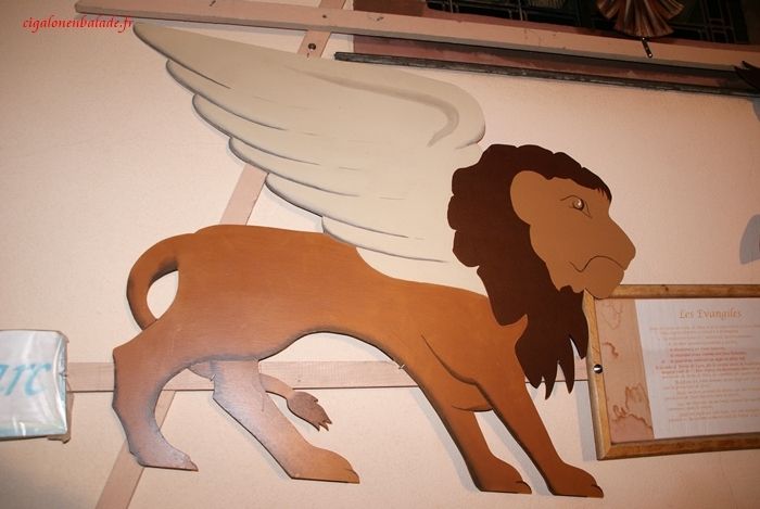 Nous débutons notre visite à l’église où nous récupérons un guide. Elle est fermée mais sur le mur extérieur, les quatre évangélistes sont représentés par leur symbole : Matthieu, un jeune homme ou un ange, Marc, un lion, Luc, un taureau, Jean, un aigle.
