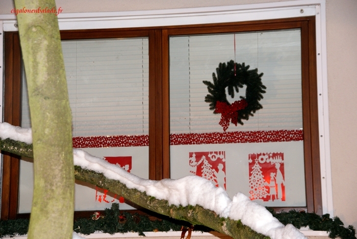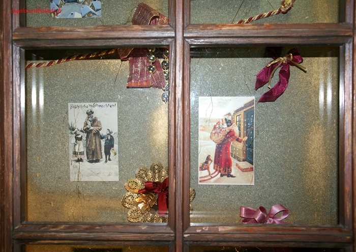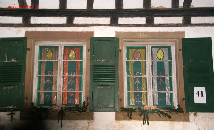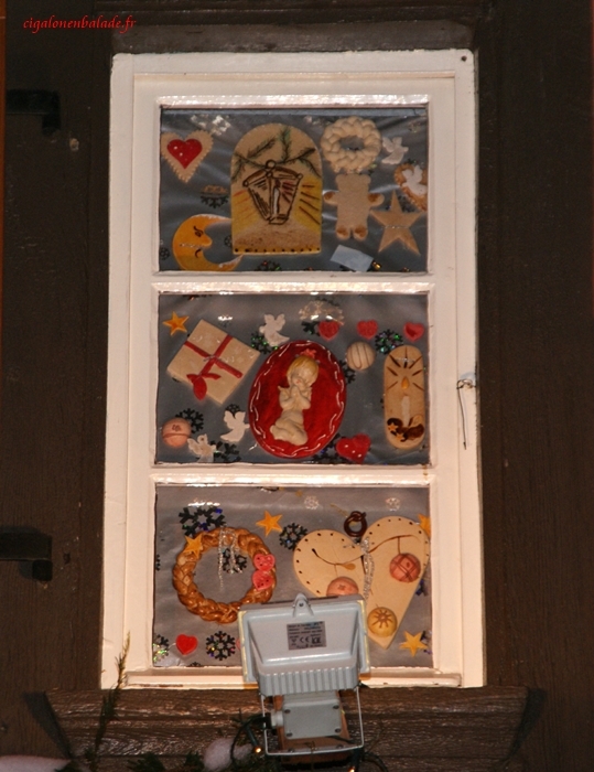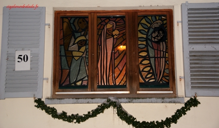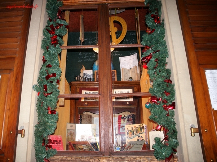 Les fenêtres de l’ancienne mairie abritent une crèche en pâte à sel et des chromos de la Nativité.