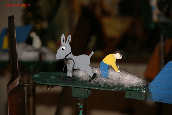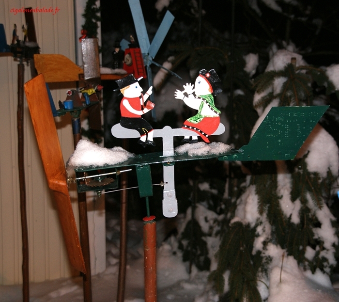 Dans le jardin des girouettes, les petites silhouettes en métal se sont arrêtées pour un moment. La vie associative villageoise est représentée dans ses activités ludiques, sportives, avicoles et paysannes. Ces girouettes sont faites main : découpage à la scie, peinture sur bois, ajout d’un mécanisme d’articulation.