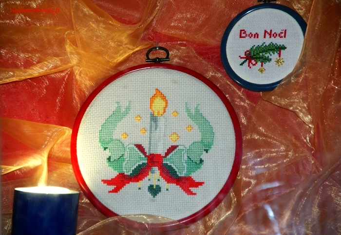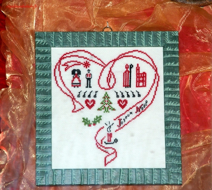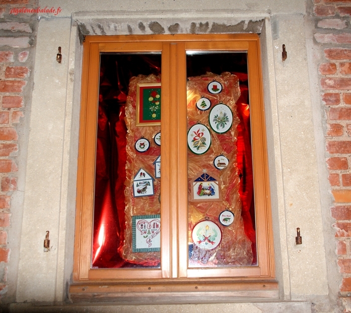 Cette fenêtre-ci présente des canevas au point de croix sur le thème de Noël.