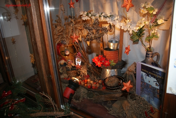 Une vitrine, composée de textes, de livres, des travaux manuels, des décorations, d’accessoires montre le Noël à l’école.