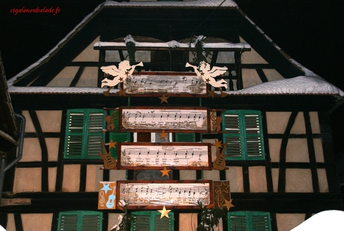 Sur la façade d’une maison alsacienne s’inscrivent les paroles du chant populaire Douce Nuit. Peut-être que si l’on chantait, l’on aurait un peu moins froid ?