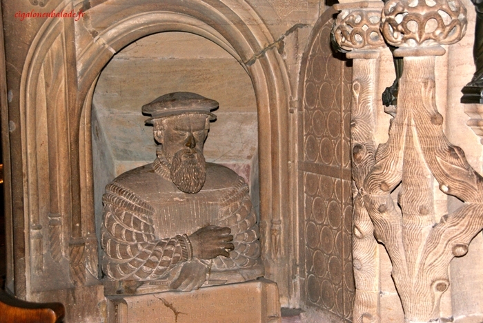 L’entrée est libre. Nous remarquons que sous la chaire le buste qui regarde par une lucarne : vraisemblablement celui du sculpteur qui s’est représenté. C’est rare au Moyen-Age mais nous avons déjà vu la même chose en Italie.