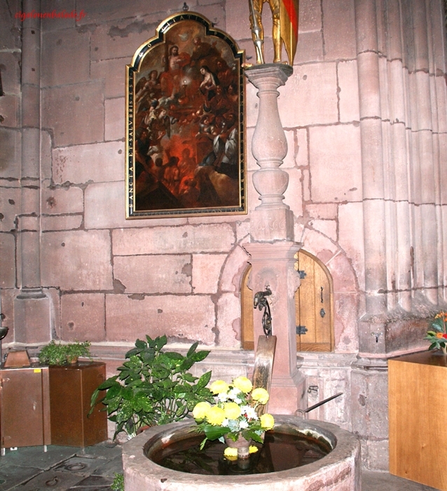 Le déambulatoire sert de remise et l’on y découvre de belles statues ainsi que deux fontaines. C’est curieux comme endroit pour édifier des fontaines!
