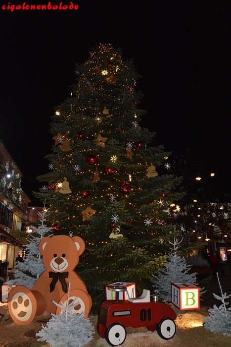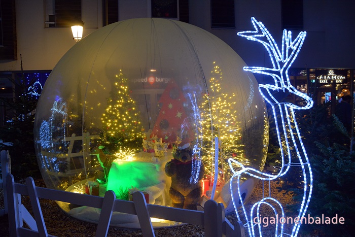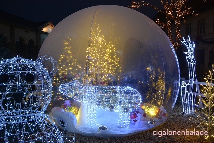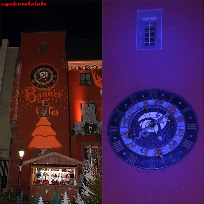 Lorsque nous quittons la chapelle St-Martin, la nuit est tombée et le centre historique s'est métamorphosé. Des lumières éclatantes et colorées mettent en valeur les monuments et les façades. Les chalets brillent dans la nuit.