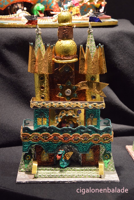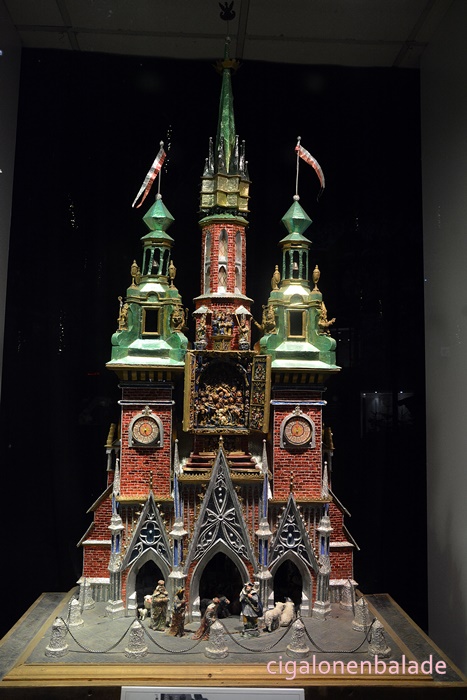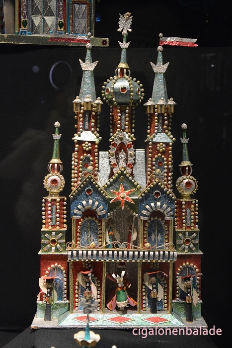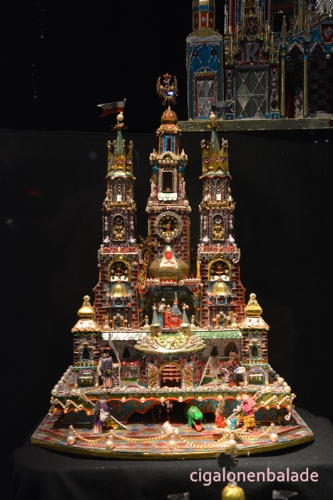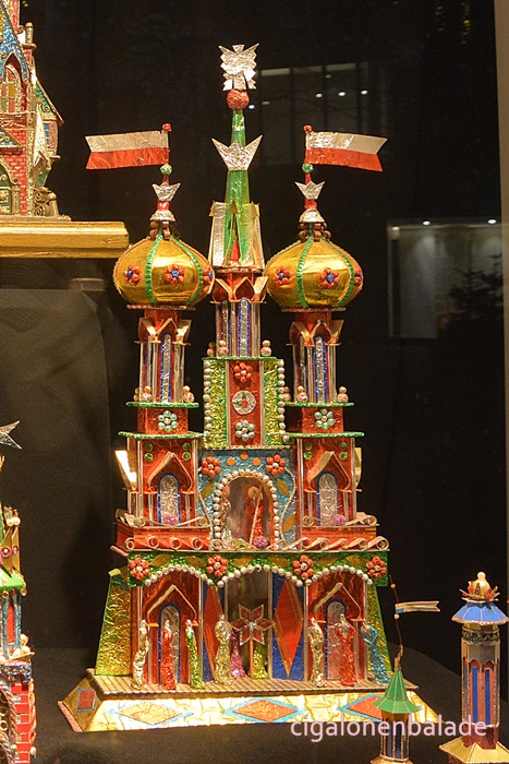 Les crèches de Cracovie, exposées dans la vitrine d’un lunetier ressemble à des églises avec différents niveaux, sur lesquels sont exposés les personnages, pas forcément bibliques.