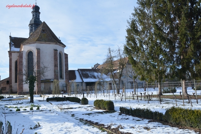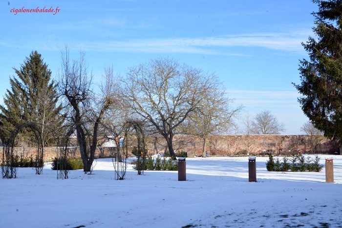 En ressortant de l’édifice, on peut traverser le cloître qui relie cure et église pour découvrir les jardins. Ils étaient fermés en 2014. C’est donc sous la neige que nous les découvrons, ce qui leur donne d’ailleurs un charme supplémentaire.