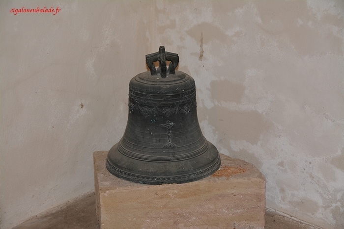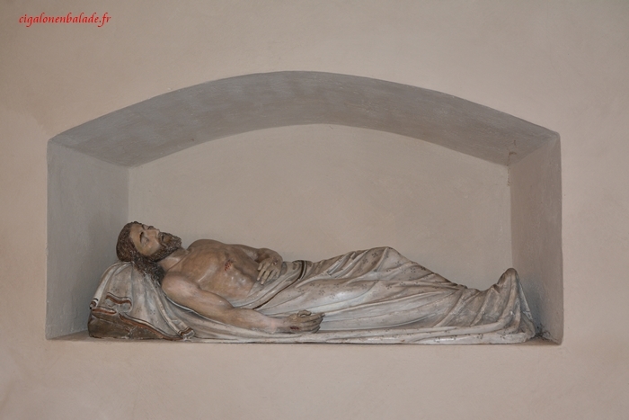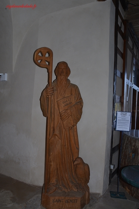 Quelques objets en décoration : cloche, gisant et statue en bois de St-Benoît.