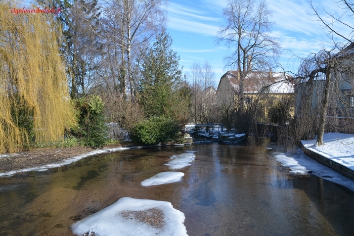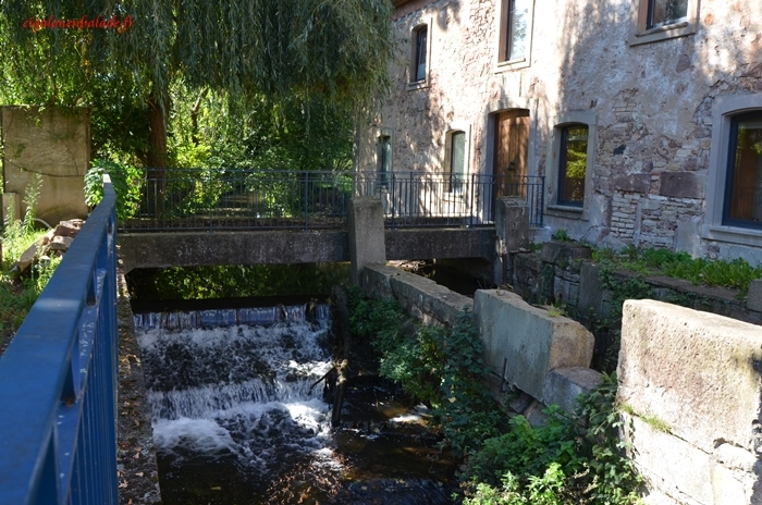 Un bruit d’eau derrière la grange dîmière nous intrigue. Il s’agit d’une petite chute sur le Mittelbach qui alimentait jadis le moulin de l’abbaye. Dommage pour Douchka. Pas d’accès au cours d’eau !