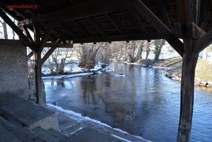 Nous trouvons un premier lavoir utilisé par les femmes habitant l’est du village, malheureusement occupé par des jeunes. Pas de photo possible sans les déloger ! Mais pas bien grave non plus car il est complètement à l’ombre des arbres.