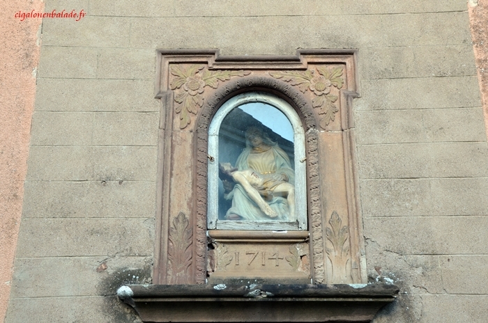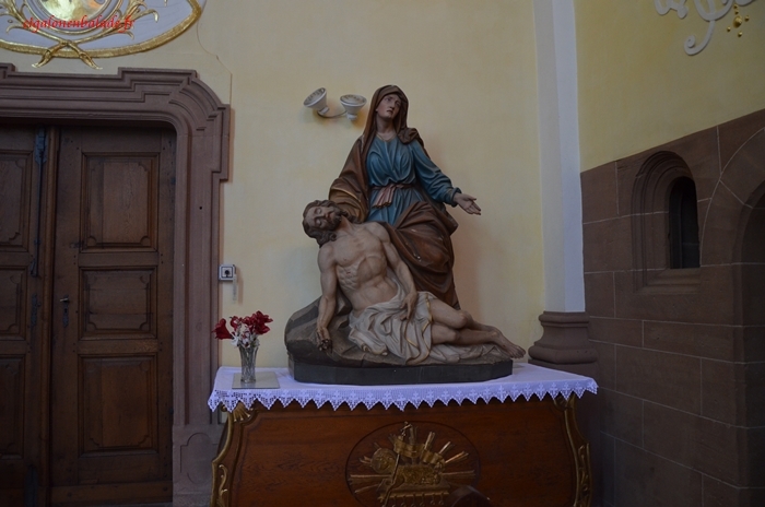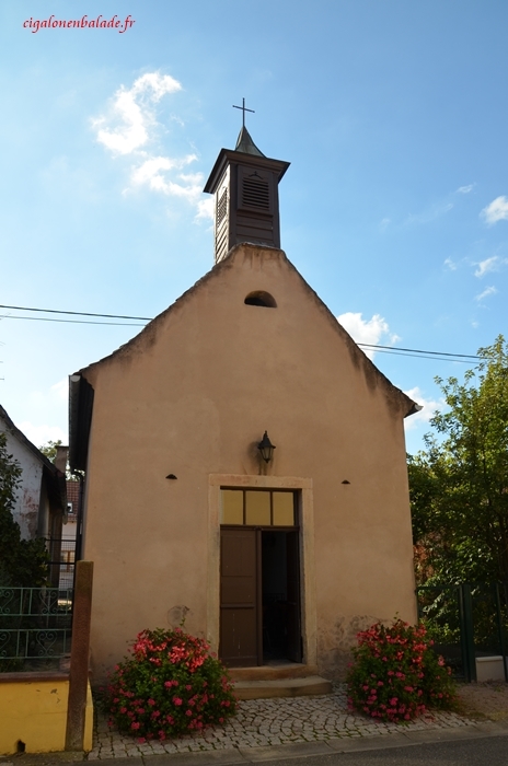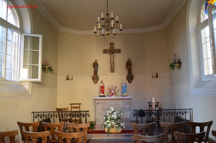 Nous revenons dans le village. La prochaine étape est une toute petite chapelle construite en 1846 grâce à la générosité et la foi de deux paroissiennes. Ces deux sœurs avaient projeté de céder leurs biens et de faire construire un oratoire public dans le jardin de leur propriété. L’autorisation leur est donnée par Monseigneur Raess, évêque de Strasbourg puis entérinée par Napoléon III. Par contre la demande est rejetée pour leur maison d’habitation qui aurait dû servir d’asile aux pauvres.